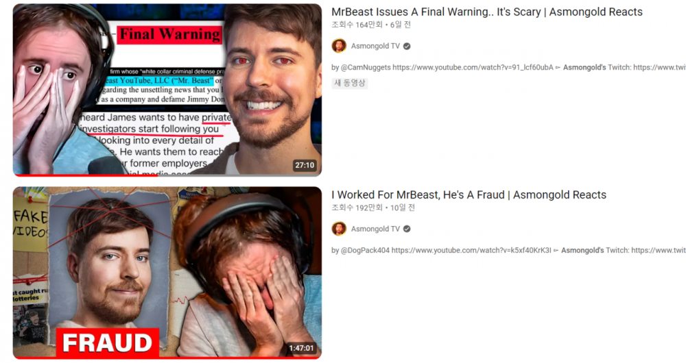 다만 미스터비스트 체급자체가 워낙 크고 어린이나 해외 시청자들도 많아서 찐 나락 보내기는 다들 불가능하다 보는중