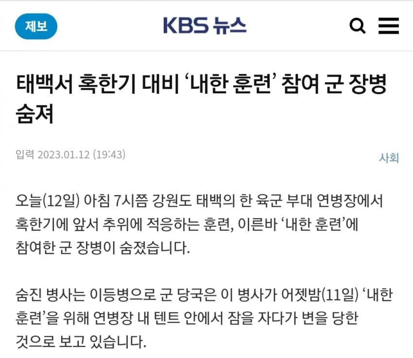 혹한기 훈련 중 이병 사망, 동사 추정